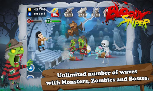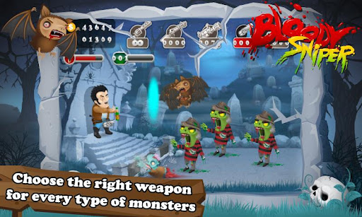 Ondas de monstros e zumbis e esqueletos atacar Sniper sangrento. Eles são fortes e rápidos, eles podem voar e rastejar, andar mais rápido quando eles vêem que o atirador está quase morto.